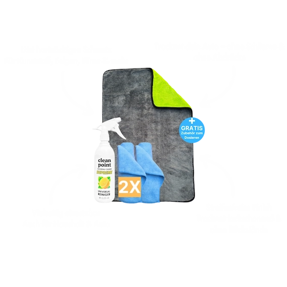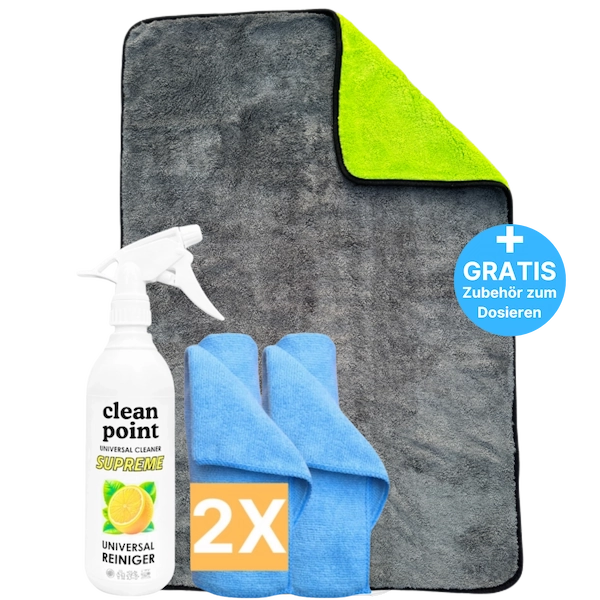 Das Set ist der Wahnsinn! Der Universalreiniger entfernt selbst hartnäckigen Schmutz, und das Trockentuch ist einfach unschlagbar – saugstark, weich und groß genug für jedes Auto. Absolute Empfehlung!